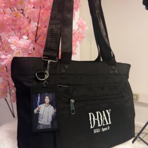 Bolso disponible para entrega inmediata tiene 2 tiras para cargar de brazo y 1 tira ajustable para cargar de medio lado, ES IMPERMEABLE su medida es de 50X30cm y tiene muchos cierres y compartimientos para guardar todas tus cositas (es bastante espacioso) INCLUYE HOLDER + PHOTOCARD D-DAY
